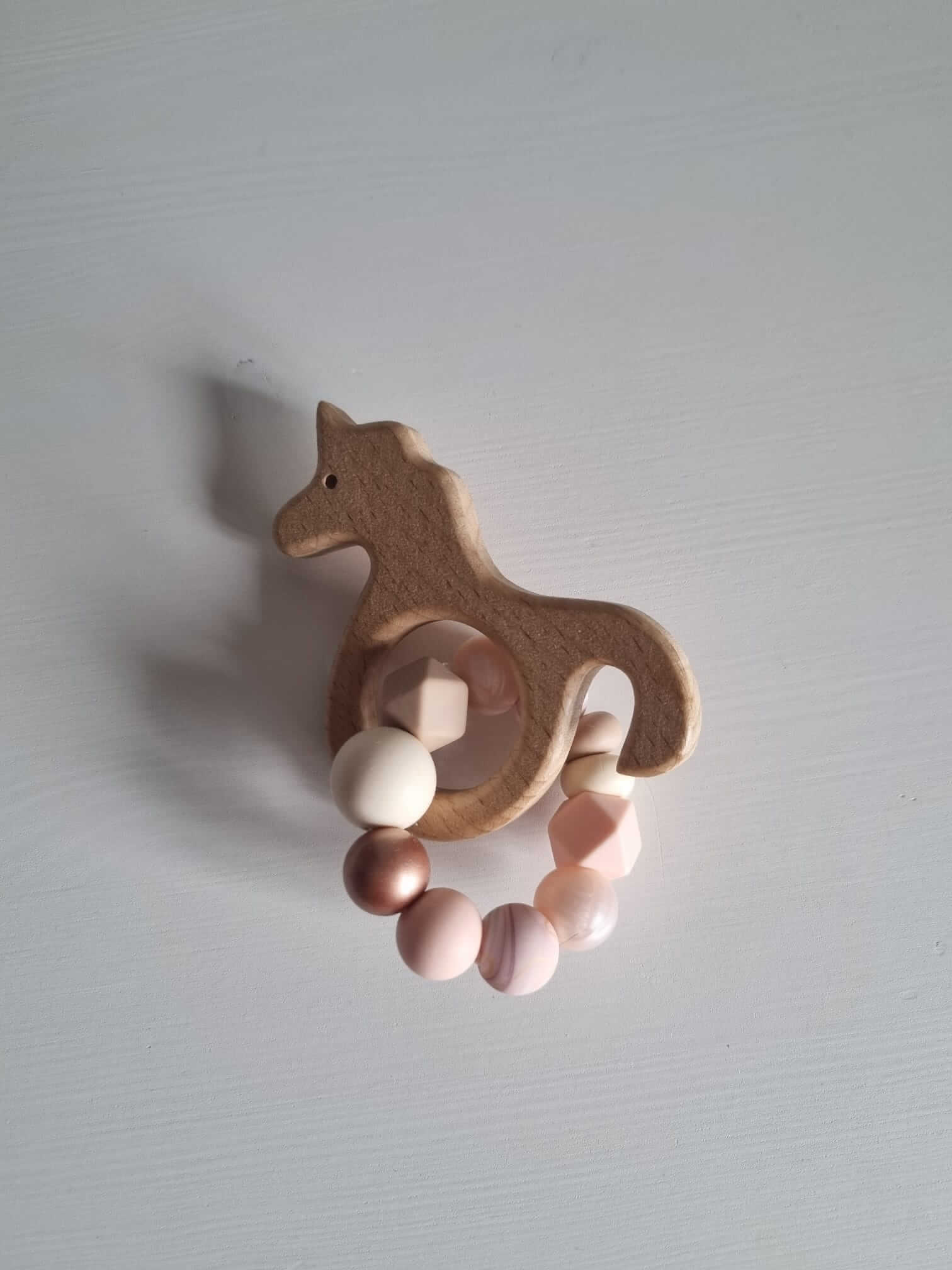 Een bijtring met een mooie houten bijtfiguur in de vorm van een eenhoorn. De kralen zijn verschillende soorten roze en crème. Deze stijl bijtring is ook verkrijgbaar als speenkoord.