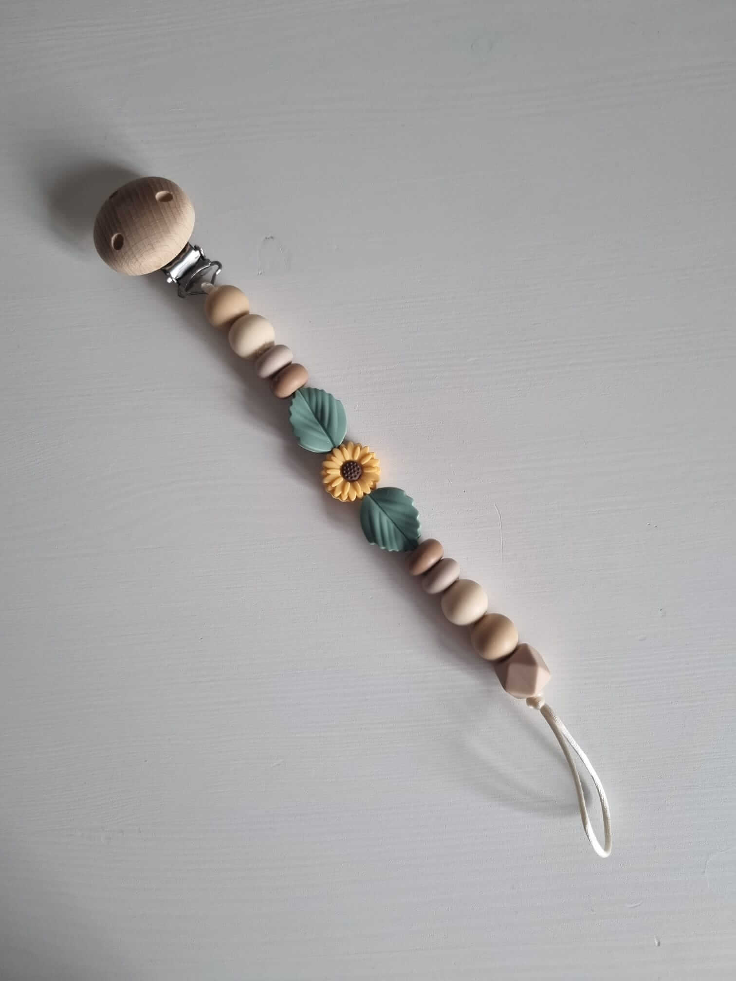 Mooie speenkoord met siliconen kralen. In de het midden zitten twee blaadjes en een zonnebloem. Dit maakt de outfit van jouw kleintje helemaal af en je verliest nooit meer een speentje.
